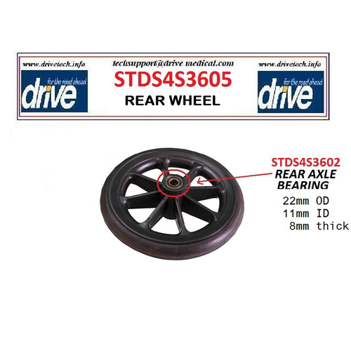 The Drive Medical Rear Wheel is designed specifically for the Drive Medical Lightweight Steel Transport Wheelchair model TR37E-SV-DDA. This high-quality replacement wheel ensures smooth mobility and secure performance for your wheelchair. Featuring precise dimensions, this rear wheel is easy to install and fits perfectly to restore or maintain the functionality of your wheelchair. Ideal for those seeking a durable, reliable rear wheel replacement, it provides stability and support for enhanced transportation ease.