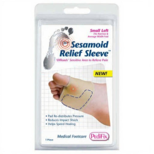 The sleeve features a soft foam ball with a sesamoid relief aperture to reduce pressure on the first metatarsal head and absorb shock. -