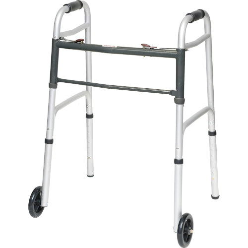 The ProBasic Adult Folding Walker with 5-Inch Wheels, Case of 4 provides durable and reliable mobility support for adults who need assistance while walking. Constructed with a strong 1-inch steel frame and adjustable height settings, it ensures stability, comfort, and safety. The easy-to-use push-button folding mechanism allows for compact storage and transport, while independently operating sides and 5-inch front wheels make navigating narrow spaces effortless. Designed with a 350 lbs weight capacity, this walker combines strength and convenience for long-lasting daily use. Buy now to enhance mobility and confidence in every step!