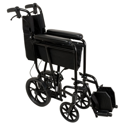 The ProBasics Aluminum Transport Chair with 12-Inch Wheels is a lightweight, caregiver-assisted mobility solution designed for safe and comfortable patient transport. Built with a durable powder-coated aluminum frame and padded nylon upholstery, this transport chair supports users up to 300 lbs while remaining easy to maneuver and lift. The 12-inch rear wheels provide improved stability on uneven surfaces, while companion-activated hand brakes enhance safety during transfers. Featuring flared push handles, a folding backrest, swing-away footrests, and a seat belt, it's ideal for hospitals, clinics, and home care. Buy now for reliable, compact, and comfortable patient transport!