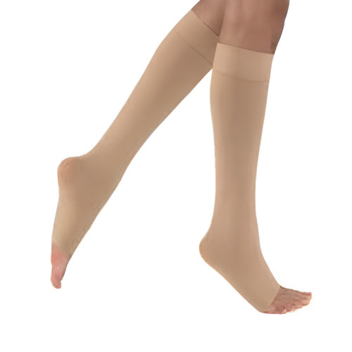 The Blue Jay X-Firm Surgical Weight Stockings 30-40 mmHg Below Knee, Open Toe, X-Large, Beige provide strong, medical-grade compression for individuals who require effective leg support to improve blood flow and manage chronic venous conditions. Designed with precision, these 30–40 mmHg compression stockings deliver graduated pressure that is firmest at the ankle and gradually decreases up the leg, ensuring optimal circulation and reducing swelling and discomfort. The open-toe design offers superior breathability, comfort, and flexibility, making these stockings suitable for both men and women. Made from a durable blend of 75% nylon and 25% spandex, they maintain elasticity and shape even after extended wear. Enhance daily comfort and support venous health—choose the Blue Jay X-Firm Surgical Weight Stockings for reliable compression therapy and long-lasting relief!